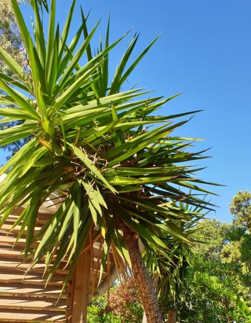 Attention à ses feuilles coupantes, qui, une fois sèches, retombent en formant une jupe autour du tronc avant de tomber.